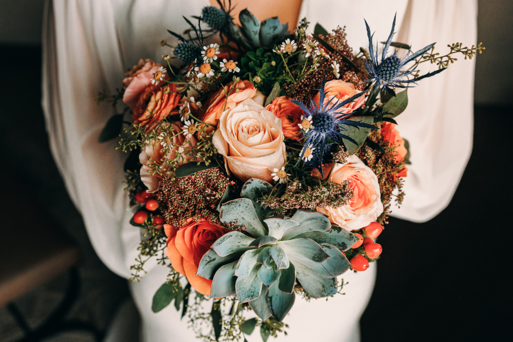 - Pops of coral, terra cotta, or turquoise in your bouquet or table arrangements